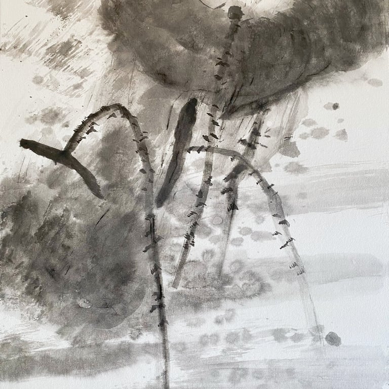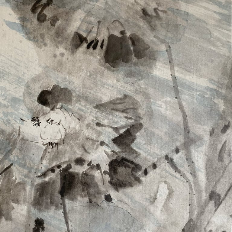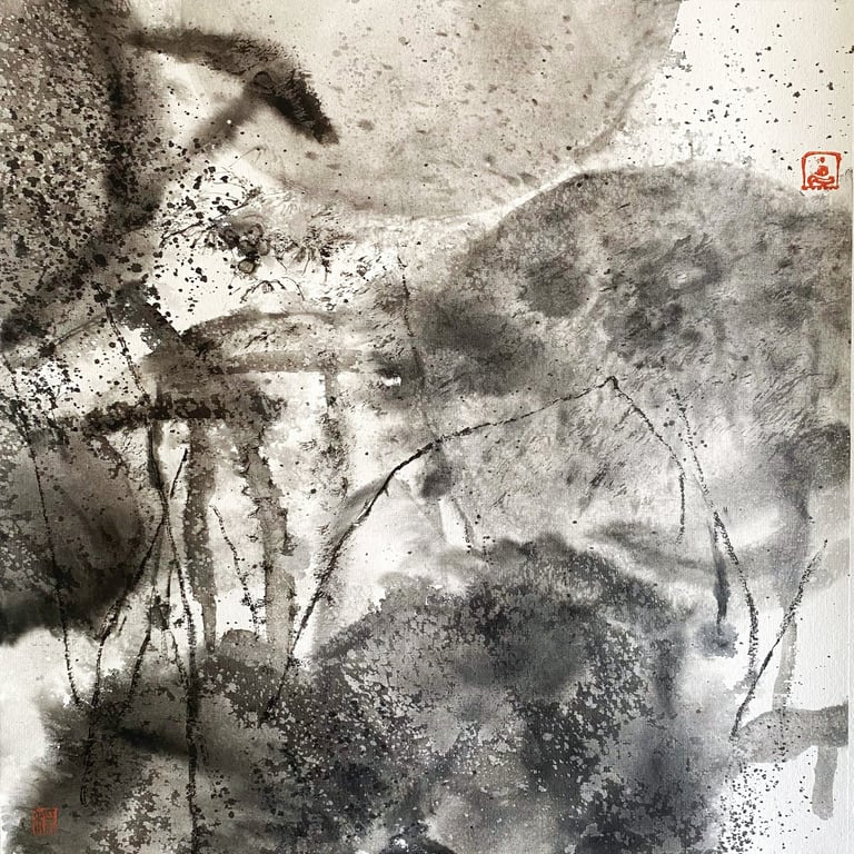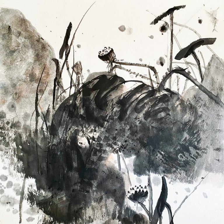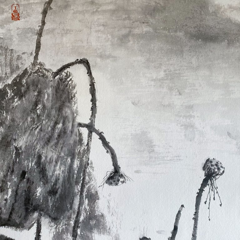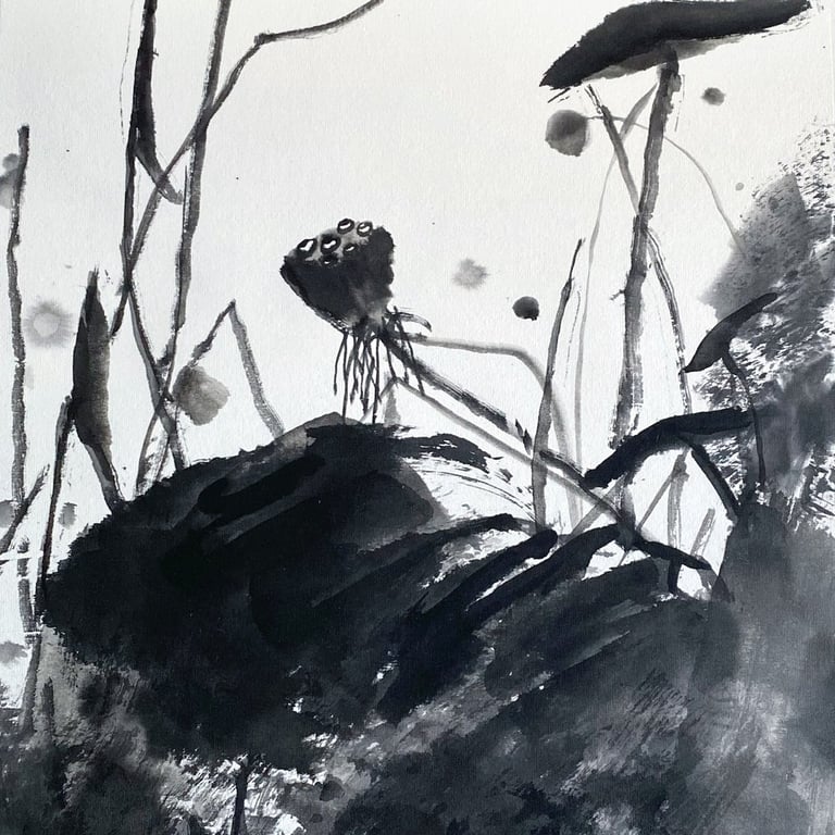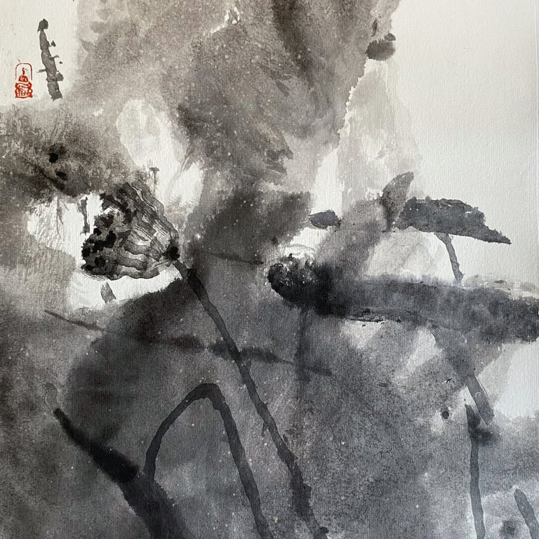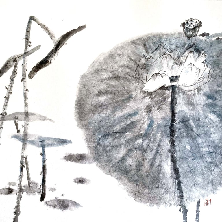 Avec la série LOTUS ÉPHÉMÈRE, j’ai voulu prolonger ces souvenirs. À travers les nuances d’encre, je cherche à capter le mouvement du lotus dans l’eau et la beauté fugace de son existence. À chaque floraison, il se prépare déjà à disparaître. C’est justement cette brièveté qui le rend précieux.